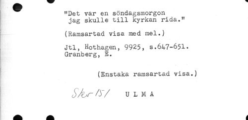 //// a y //// "Det var en söndagsmorgon //// jag skulle till kyrkan rida." //// (Ramsartad visa med mel.) //// Jtl, Hothagen, 9925, s.647-651. //// Granberg, E. //// (Enstaka ramsartad visa.) //// - //// * //// *' //// ^ U L M A ////
