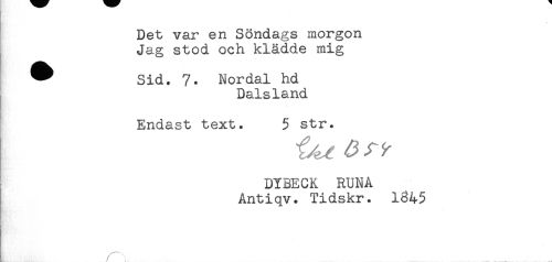 //// Det var en Söndags morgon //// Jag stod och klädde mig //// ^ Sid. 7. Nordal hd //// Dalsland //// Endast text. 5 str. //// DYBECK RUNA //// Antiqv. Tidskr. 1345 //// ! ////