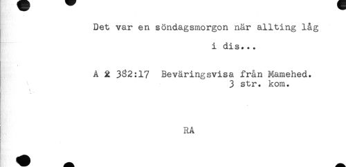 //// Det var en söndagsmorgon när allting låg //// i dis... //// \ //// A 2 3^2:17 Beväringsvisa från Mamehed. //// 3 str. kom. //// r* //// RA ////