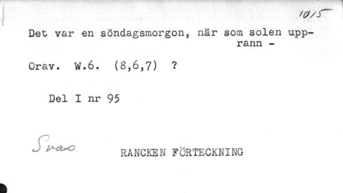 //// /<7/J //// Det var en söndagsmorgon, när som solen upp- //// rann - //// Orav. W.6. (6,6,7) ? //// Del I nr 95 //// r //// ^ RANCKEN FÖRTECKNING ////