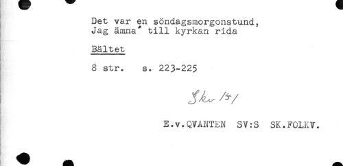 //// Det var en söndagsmorgonstund, //// Jag ämna* till kyrkan rida //// Bältet //// 6 str. s. 223-225 //// ^ /v //// E.v.QVANTRN SV:S SK.FOLKV. ////