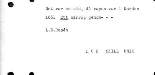 //// Det var en tid, då vapen var i Norden //// 1861 Ett härrop genom- - - //// L.E.Rusen //// L U B SKILL UNIK //// - ////