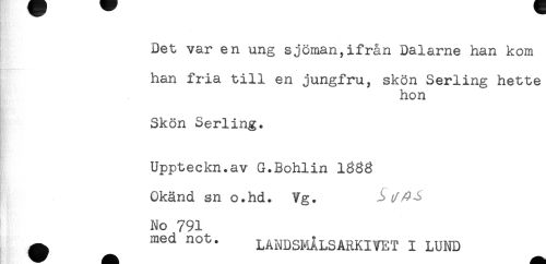 //// Det var en ung sjöman,ifrån Dalarne han kom //// han fria till en jungfru, skön Serling hette //// hon //// Skön Serling. //// Uppteckn.av G.Bohlin 1033 //// Okänd sn o.hd. Vg. //// No 791 //// med not. LANDSMÅLSARKIVET I LUND ////