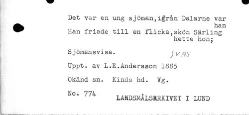 //// Det var en ung sjöman,igrån Dalarne var //// ^^ han //// ^ Han friade till en flicka,skön Särling //// hette hon; //// Sjömans vi sa. ) i //// /Uppt. av L.E.Andersson 1385 //// Okänd sn. Kinds hd. Vg. //// No. 774 //// LANDSMALSRRKIVET I LUND ////