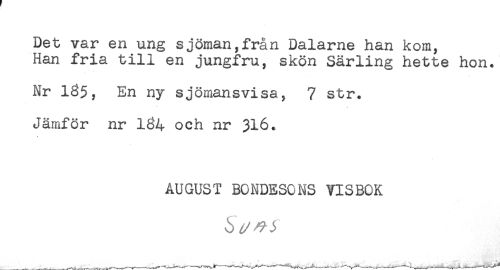 //// Det var en ung sjöman,från Dalarne han kom, //// Han fria till en jungfru, skön Särling hette hon. //// Nr 185, En ny sjömansvisa, 7 str. //// Jämför nr 184 och nr 316. //// AUGUST BONDESONS VISBOK //// ö - , > ////