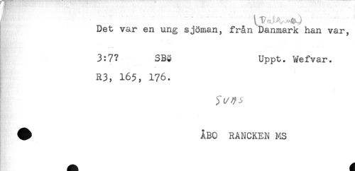 //// Det var en ung sjöman, från Danmark han var, //// - - - - //// 3:7? SB3 Uppt. Wefvar. //// R3, 165, 176. //// v //// , t/ ^ //// ^ ÅBO RANCKEN MS ////