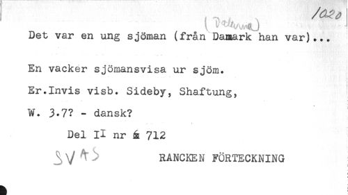 //// Det var en ung sjöman (från Damark han var)... //// .. //// i //// f //// En vacker sjömansvisa ur sjöm. //// Er.Invis visb. Sideby, Shaftung, //// ! //// W. 3.7? - dansk? //// Del H nr å 712 //// RANCKEN FÖRTECKNING ////