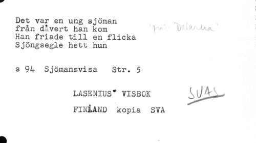 //// Det var en ung sjöman ^ //// från dåvert han kom W * //// Han friade till en flicka //// Sjöngsegle hett hun //// s 94 Sjömansvisa Str. $ //// LASENIUS* VISBOK ^ ^ //// FINLAND kopia SVA ////