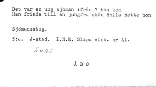 //// Det var en ung sjöman ifrån ? han kom //// Han friade till en jungfru skön Solia hette hon //// Sjömanssång. //// * ' //// 5:4. J-stad. I.N.E. Slips visb. nr 41. //// ÅBO ////