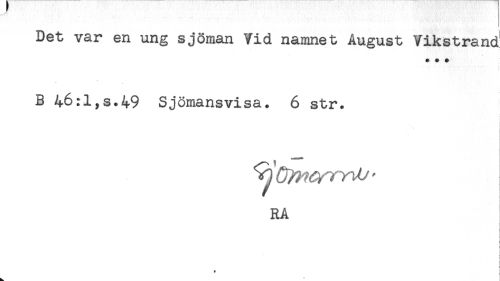 //// Det var en ung sjöman Vid namnet August Vikstrand //// * * * //// < //// B 46:l,s.49 Sjömansvisa. 6 str. //// RA //// * ////