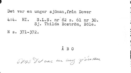 //// < //// Det var en unger sjöman,från Dover //// 4:4. Hl. S.L.S. nr 62 s. 61 nr 30. //// Sj. Thilda Boström, Böle. //// N s. 371-372. E //// H //// g //// ÅBO //// ! //// , ^ i ////