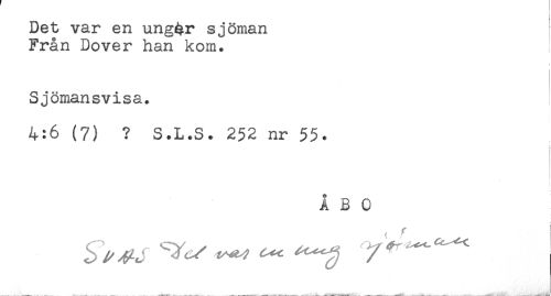//// Det var en ung4r sjöman //// Från Dover han kom. ! //// f //// ! //// Sjömansvisa. //// 4:6 (7) ? S.L.S. 252 nr 55. //// ÅBO //// ^ ^ j ^ ^ ^ ^ / ^ " ////
