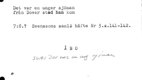 //// Det var en unger sjöman //// från Dover stad han kom //// 7:8.? Svenssons samlö häfte Nr 5.s.141-142. //// ÅBO //// r ////