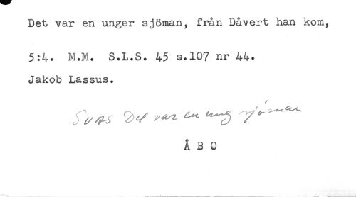 //// Det var en unger sjöman, från Dåvert han kom, //// 5:4* M.M. S.L.S. 45 s.10? nr 44. //// Jakob Lassus. //// r //// ÅBO ////