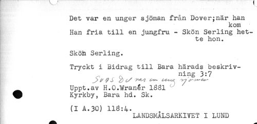 //// = //// ; Det var en unger sjöman från Dover;när han //// ! kom - //// Han fria till en jungfru - Skön Serling het- //// te hon. //// Sköh Serling. //// Tryckt i Bidrag till Bara härads beskriv- //// ! (x ning 3:7 //// Uppt.av H.O.Wranér 1881 //// ^ Kyrkby, Bara hd. Sk. //// (I A.30) 118:4. //// LANDSMALSARKIVET I LUND ////