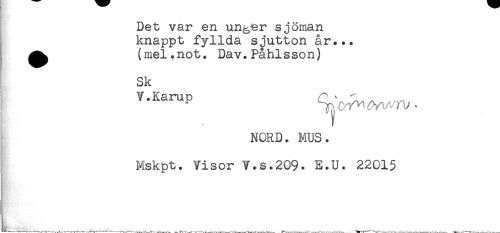 //// Det var en un^,er sjöman //// knappt fyllda sjutton år... //// ^^ (mel.not. Dav.Påhlsson) //// Sk //// NORD. MUS. //// Mskpt. Visor V.s.209. E.U. 22015 ////