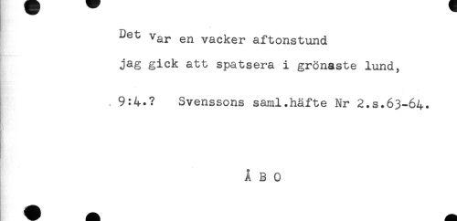 //// Det var en vacker aftonstund //// jag gick att spatsera i grönaste lund, //// * //// 9:4.? Svenssons saml.häfte Nr 2.s.63-64. ////