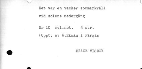 //// Det var en vacker sommarkväll //// vid solens nedergång //// Nr 10 mel.not. 3 str. //// (Uppt. av K.Ekman i Pargas //// ^ BRAGE VISBOK ////