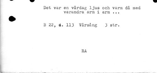 //// Det var en vårdag ljus och varm då med //// varandra arm i arm ... //// B 22, é. 113 Vårsång 3 str. //// RA ////