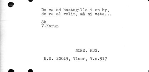 //// De va ed bastugille i en by, //// de va så rolit, må ni veta... //// Sk //// V.Karup //// NORD. MUS. //// E.U. 22015, Visor, V.s.517 ////