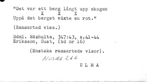 //// "Det var ett berg långt upp skogen //// X X X ^ //// Uppä det berget växte en rot." //// (Ramsartad visa.) //// Sdml. Näshulta, 347:43, s.41-44 //// Eriksson, Gust, (bd nr 16) ! //// (Enstaka ramsartade visor). ////