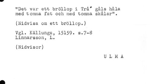 //// "Det var ett bröllop i Trå* gåls håla //// med tomma fat och med tomma skålar". //// (Nidvisa om ett bröllop.) //// Vgl. Källunga, 15159. s.7-3 //// Linnarsson, L. //// (Nidvisor) //// U L M A ////