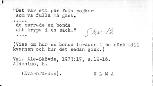 //// "Det var ett par fula pojkar //// som va fulla^mä gäck, //// + + + $ + //// de narrade en bonde //// att krypa i en säck." / ^ //// .... //// i //// ! //// (Visa om hur en bonde lurades i en säck till //// kvarnen och hur det sedan gick.) //// Vgl. Ale-Skövde, 1973:17, s.12-16. //// Aldenius, H. //// ! //// ; //// (Kvarnfärden). ULMA : //// t //// E ////