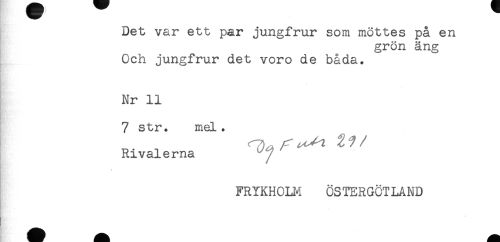 //// Det var ett par jungfrur som möttes på en //// grön äng //// Och jungfrur det voro de båda. //// Nr 11 //// 7 str. mel. //// Rivalerna //// FRYKHOLM ÖSTERGÖTLAND ////
