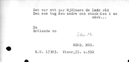 //// Det var ett par Mjölnare de lade råd //// Den ene tog den andre och stack den i en //// säck... //// ** //// < //// Ds //// Brålanda sn //// J : ^ //// NORD. MUS. //// E.U. 17363. Visor,II. s.592 ////