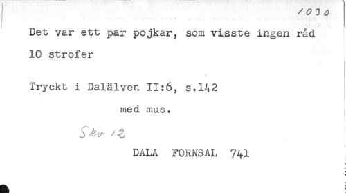 //// f ^ (7 J <9 //// } ......* " ' ... .....' * //// Det var ett par pojkar, som visste ingen råd //// 10 strofer //// i //// ! //// Tryckt i Dalälven 11:6, s.142 //// med mus. //// i //// ! //// j ^ V- //// /- . - . t //// DALA FORNSAL 741 ////