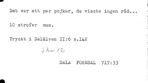 //// Det var ett par pojkar, de visste ingen råd... ^ //// i //// 10 strofer mus. //// Tryckt i Dalälven 11:6 s.142 ! //// j //// j 4 ^ / ^ //// r //// DALA FORMSAL 717:33 ////