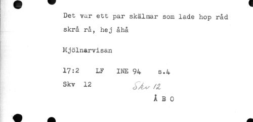 //// Det var ett par skälmar som lade hop råd //// skrå rå, hej åhå //// Mjölnarvisan //// 17:2 LF INE 94 s.4 //// S*v 12 ^ ////