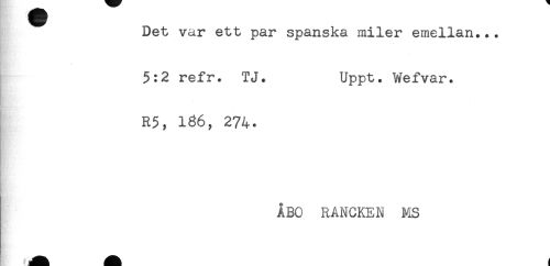 //// Det var ett par spanska miler emellan... //// 5:2 refr. TJ. Uppt. Wefvar. //// * //// . //// R5, 186, 274. //// ÅBO RANCKEN MS ////
