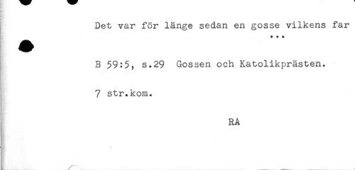 //// Hy //// Det var för länge sedan en gosse vilkens far //// * * * //// B 59:5, s.29 Gossen och Katolikprästen. //// 7 str.kom. //// RA //// r' ____ ////