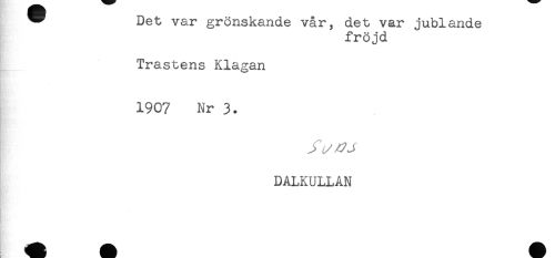 //// ^ Det var grönskande vår, det var jublande //// fröjd //// Trastens Klagan //// 1907 Nr 3. //// 47 J //// DALKULLAN ////