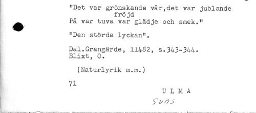 //// "uet var gronsicanae var,det var jublande //// fröjd //// ^ På var tuva var glädje och smek." //// "Den störda lyckan". //// Dal.Grangärde, 11462, s.343-344. //// Blixt, 0. //// (Naturlyrik m.m.) //// 71 //// U L M A ////