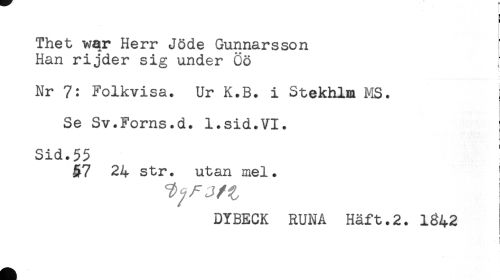 //// < //// Thet wqr Herr Jöde Gunnarsson //// Han rijder sig under Öö //// Nr 7: Folkvisa. Ur K.B. i Stekhlm MS. //// Se Sv.Forns.d. 1.sid.VI. //// i- //// Sid.55 //// 24 str. utan mel. ' //// DYBECK RUNA Häft.2. 1342 //// ' ! ////