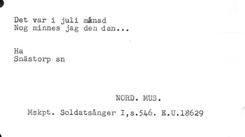 //// Det var i juli månad //// Nog minnes jag den dan... //// Ha //// Snästorp sn //// NORD. MUS. //// Mskpt. Soldatsånger I,s.546. E.U.13629 ////