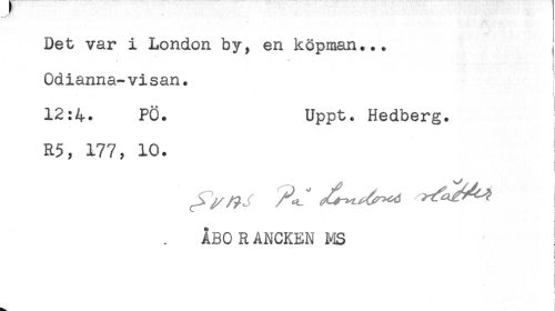 //// Det var i London by, en köpman... //// < ^ //// Odianna-vi san. //// 12:4. PÖ. Uppt. Hedberg. //// R5, 177, 10. //// t //// ÅBO RANCKEN MS //// t //// * ////