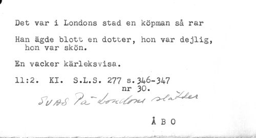 //// Det var i Londons stad en köpman så rar //// Han ägde blott en dotter, hon var dejlig, //// hon var skön. //// En vacker kärleksvisa. //// 11:2. Kl. S.L.S. 277 s.346-347 //// nr 30. ////