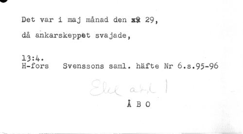 //// Det var i maj månad den 29, //// ** //// då ankarskepp6t svajade, //// 13:4. //// H-fors Svenssons saml. häfte Nr 6.s+95-96 //// ÅBO ////
