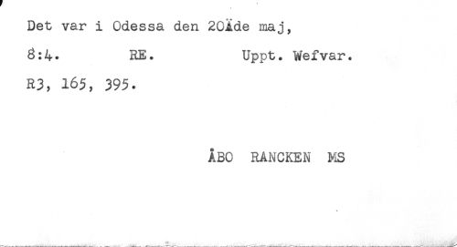 //// Det var i Odessa den 20ide maj, //// 8:4. RE. Uppt. Wefvar. //// R3, 165, 395. //// ÅBO RANCKEN MS ////