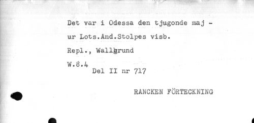 //// * //// Det var i Odessa den tjugonde maj - //// ' - . - . //// ur Lots.And.Stolpes visb. //// ., .< * . — J - —< ^ ... " K ..- //// Repl., Wall^rund //// W.8.4 //// Del II nr 717 //// ' ^ RANCKEN FÖRTECKNING ////