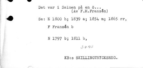 //// s //// Det var i Saimen på en ö... //// I (Åv F+M.Franzén) //// - . * //// - //// Se: E 1800 h; 1839 a; 1854 m; 1865 rr, //// F Franzén b //// N 1797 b; 1811 b, //// ! //// t //// t //// ! S w //// KB:s SKILLINGTRYCKSREG. //// / ^ ---- — . ////