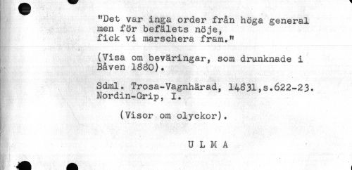 //// "Det var inga order från höga general //// men för befälets nöje, //// fick vi marschera fram." //// HgS^' -t //// (Visa om beväringar, som drunknade i //// ^ Båven lggO). //// * ' . .* < //// Sdml. Trosa-Vagnhärad, 14831,s.622-23. //// Nordin-Grip, 1. //// (Visor om olyckor). //// § //// U L M A //// * //// ,1 -' < - <', , s < //// - ////