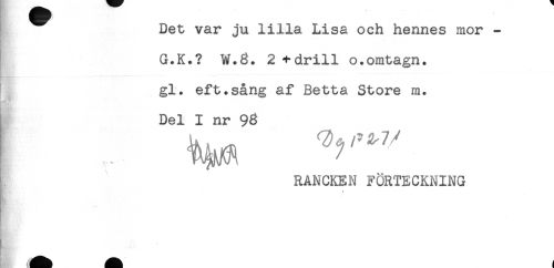 //// Det var ju lilla Lisa och hennes mor - //// G.K.? W.3. 2 +drill o.omtagn. //// gl. eft.sång af Betta Store m. //// Del I nr 96 //// RANCKEN FÖRTECKNING //// t //// L ////
