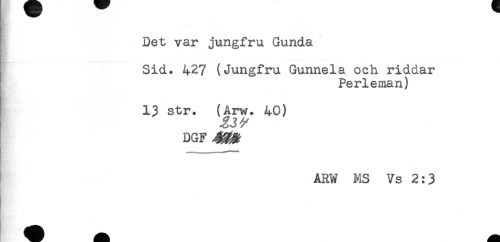 //// Det var jungfru Gunda //// ! Sid. 427 (Jungfru Gunnela och riddar //// Perleman) //// 13 str. (Arw. 40) //// DGF //// ARW MS Vs 2:3 ////