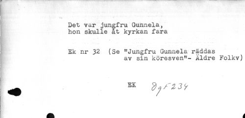 //// * //// ....... //// Det var jungfru Gunnela, //// hon skulle åt kyrkan fara //// Ek nr 32 (Se "Jungfru Gunnela räddas //// j av sin köresven"- Åldre Folkv) //// I ^ EK ////