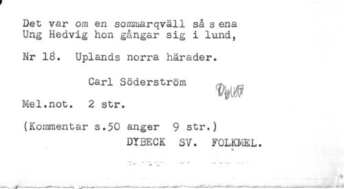 //// Det var om en sommarqväll så s ena //// Ung Hedvig hon gångar sig i lund, //// Nr 18. Uplands norra härader. //// Carl SSderstrS. ^ //// Mel.not. 2 str. //// (Kommentar s.$0 anger 9 str.) //// DYBECK SV. FOLKMEL. //// — - —- — * — — u — — //// ^ - , .. //// ... , ,. . ....... ////