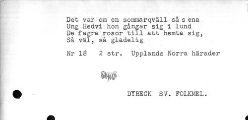 //// .. . ... .. .. ... ... , . //// Det var om en sommarqväll så s ena //// Ung Hedvi hon gångar sig i lund //// De fagra rosor till att hemta sig, //// Så väl, så gladelig //// Nr 16 2 str. Upplands Norra härader //// ^ DYBECK SV. FOLKMEL. ////